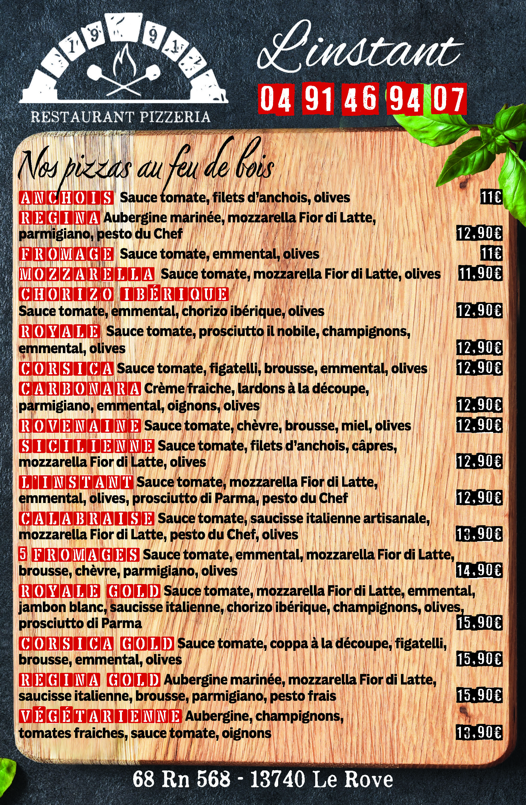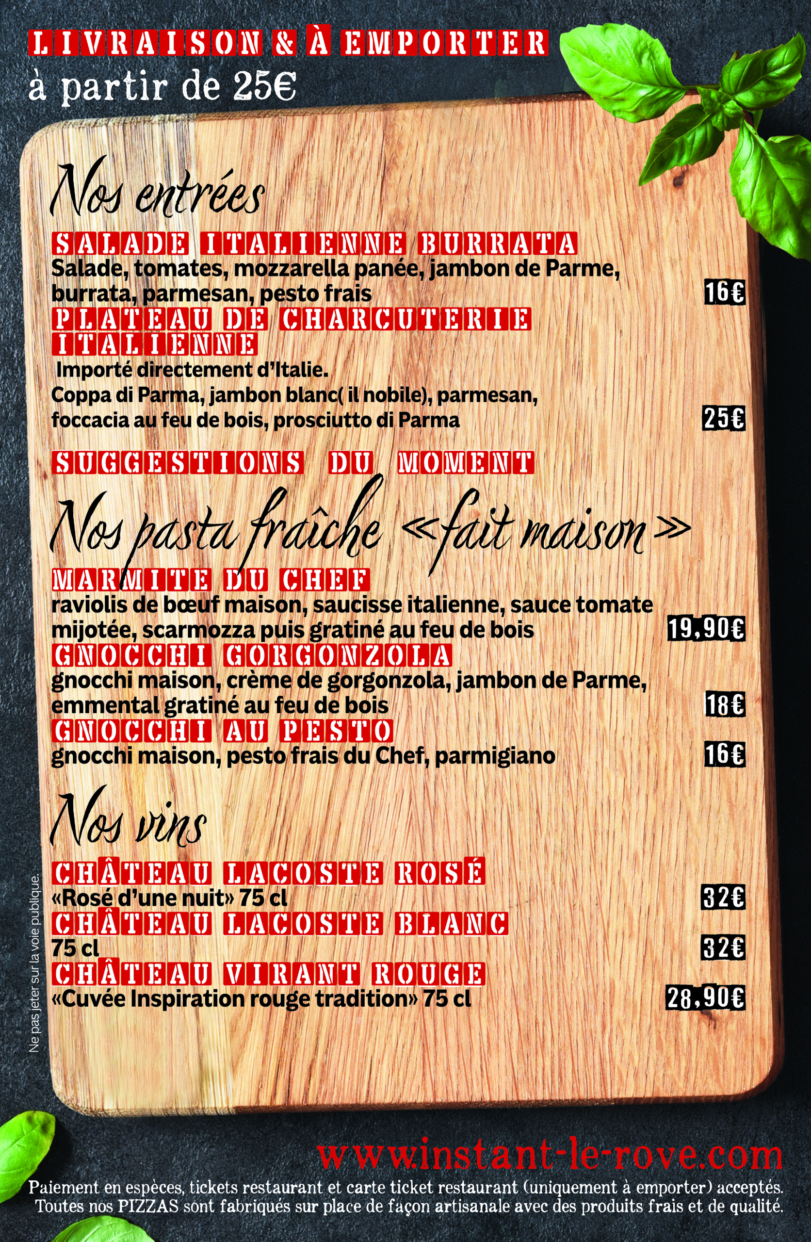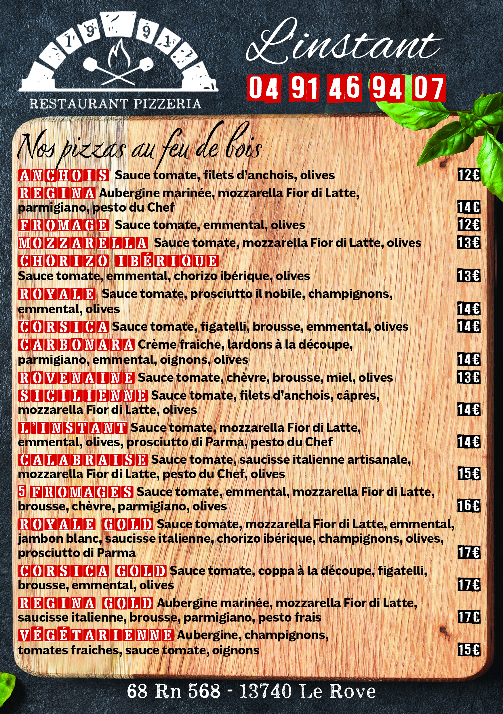Sur place, à emporter ou à la livraison (Le Rove, Ensuès-la-Redonne, Niolon, La Vesse uniquement les soirs d’ouverture).